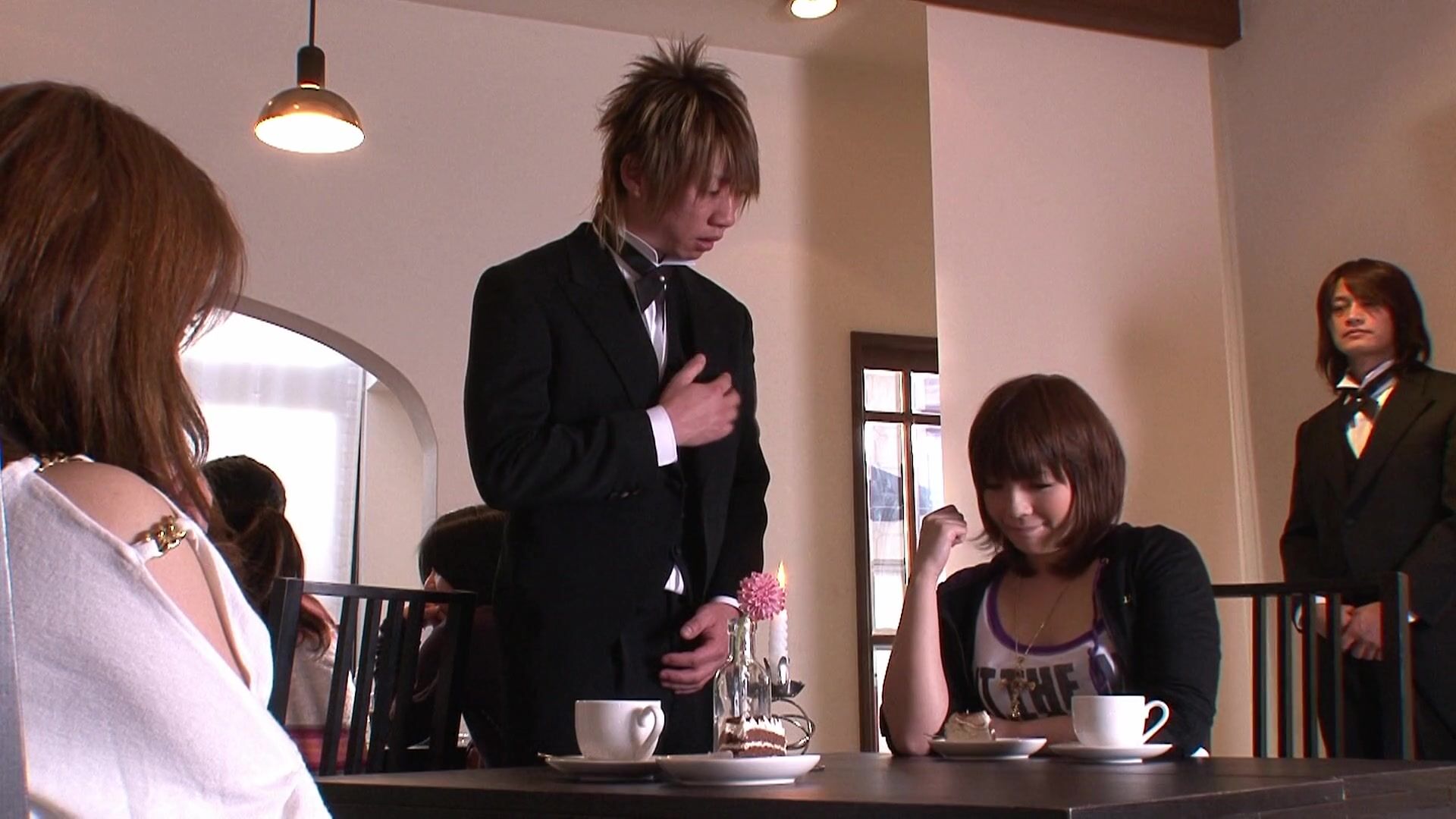 One of the waiters takes the Japanese hot redhead at the back of the restaurant to satisfy all her needs. He gives her a glass dildo to prepare the mood and then gives her his hard cock